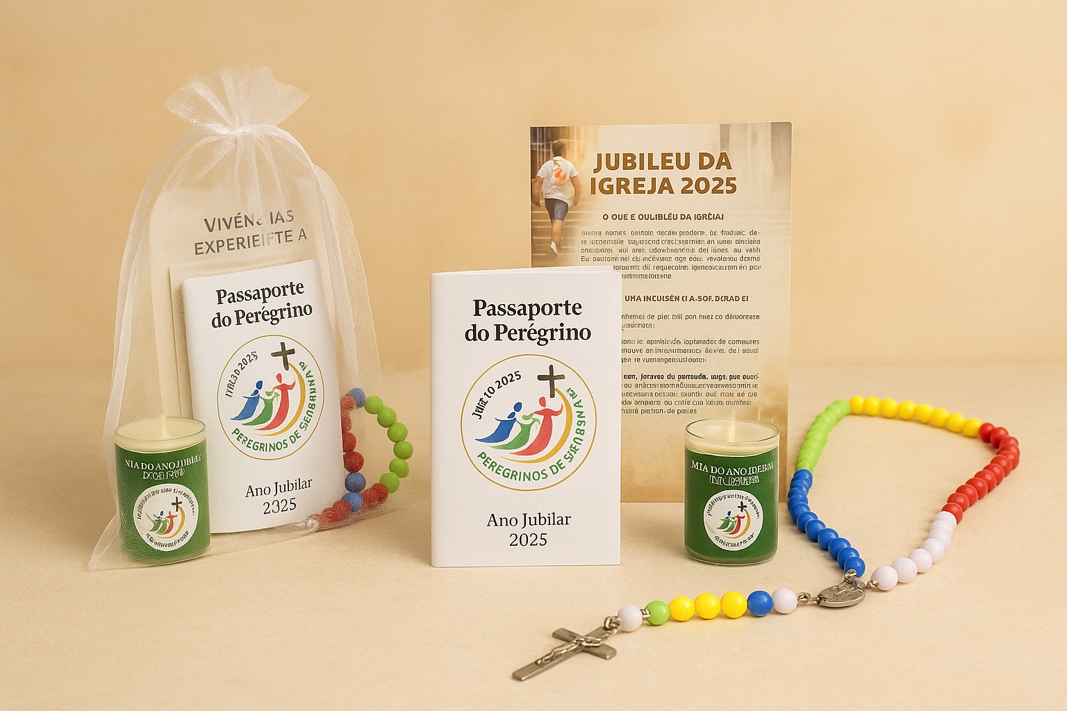 1 Vela, 1 terço, 1 passaporte e 1 folheto.